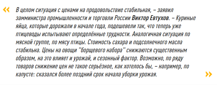 В частности, замглавы Минпромторга РФ Виктор Евтухов на днях заявил, что ситуацию с ценами на продовольствие сейчас можно назвать стабильной, и с гордостью добавил: «в том числе благодаря действиям властей» (Подробнее ➤).