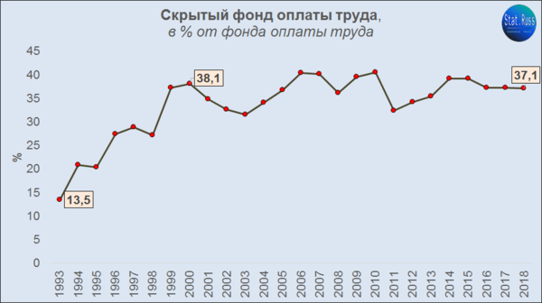 Источник: Росстат. Рассчитывался, как отношение скрытой оплаты труда к очищенному размеру оплаты труда наёмных работников от скрытой составляющей.