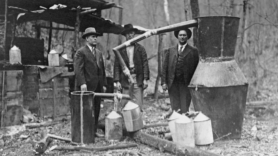 В 1929 году официальные лица в Теннесси пресекли операцию по контрабанде и позировали рядом с частично разобранным ликероводочным заводом, который производил некачественный белый самогон.