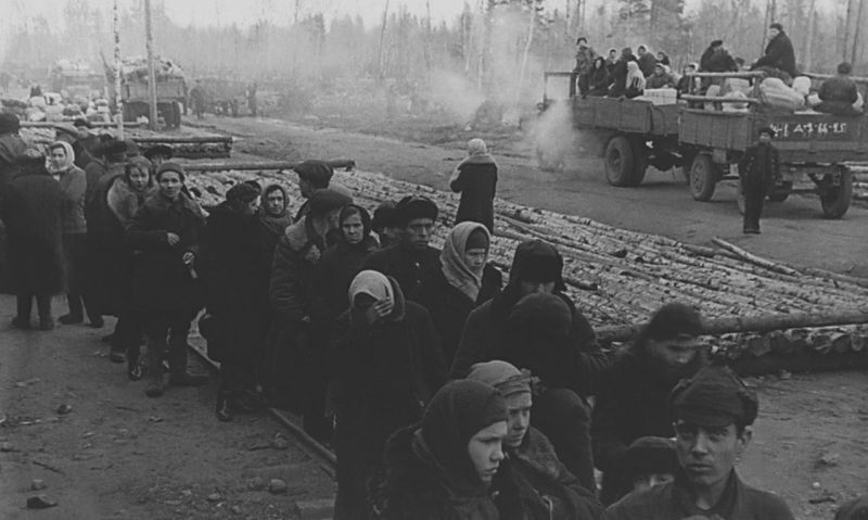 Жители блокадного Ленинграда в очереди за получением пищи на станции Борисова Грива.