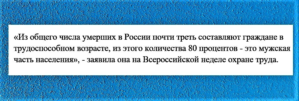 Вице-премьер четко и прямо заявила, что третья часть населения умирает в трудоспособном возрасте. И 80% это наши мужчины.