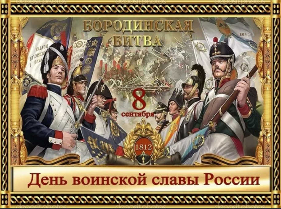 8 сентября отмечается День воинской славы России — День Бородинского сражения русской армии под командованием М.И. Кутузова с французской армией (1812 год). Он учрежден Федеральным законом № 32-ФЗ от 13 марта 1995 года «О днях воинской славы и памятных датах России».