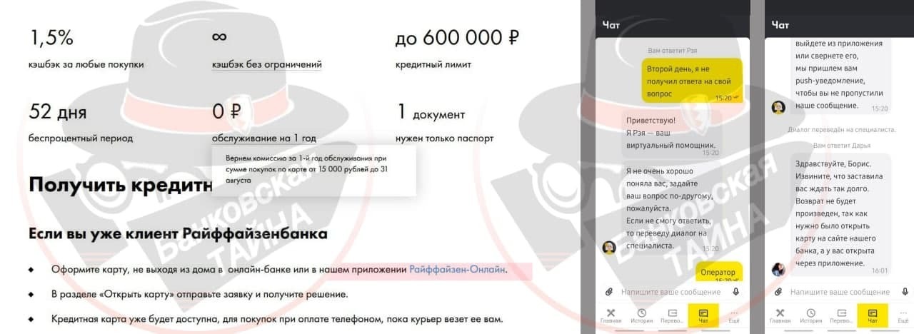 Как видно из скриншота с сайта Райфа – на странице явный призыв от банка оформить карту в том числе через приложение. Без всяких сносок, мелкого шрифта и прочего. На странице не указано, что в таком случае возврат денег не будет осуществлен.