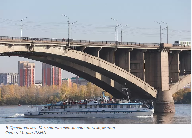 В Красноярске с Коммунального моста упал мужчина. Информацию очевидцев подтвердили в КГКУ «Спасатель». Произошло это накануне, 8 сентября, около 10 часов утра. Предварительно известно, что на втором пролете моста пожилой человек перебрался через перила, а затем оказался в воде. Здесь основное русло реки, большая глубина, плюс вода холодная. В результате, когда мужчину нашли спасатели на катере, помочь ему уже было нельзя. Тело передали в полицию для дальнейших действий, там в первую очередь установят личность погибшего, затем возможные причины, по которым он оказался на мосту.
