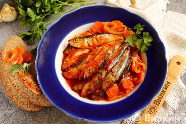 Подаем домашнюю кильку в томатном соусе вместе, например, с ломтями хлеба и свежей зеленью.