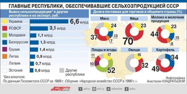 «Ни одна республика не обеспечивала себя всеми видами продовольствия. У каждой была своя специализация в зависимости о того, что в ней выгодно производить, – рассказывает гл. научный сотрудник Центра агропродовольственной политики РАНХиГС Василий Узун. – По объёму производства РСФСР занимала в союзном сельском хозяйстве около 50%, Украина – 25%, Белоруссия – 10%. Но на душу населения Россия производила не так много сельхозпродукции, так как специализировалась на промышленности, и больше людей жило в городах».