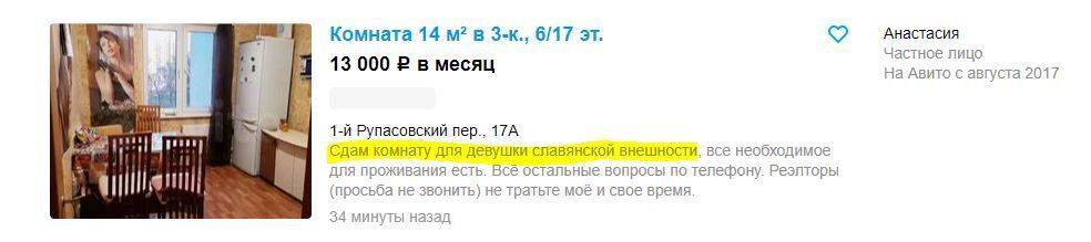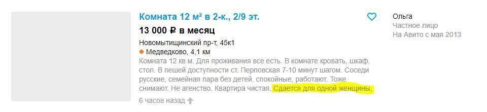 К своему большому удивлению, обнаружил для себя на таких досках объявлений, как «Авито», рекламные публикации, направленные на дискриминацию мужчин в России.