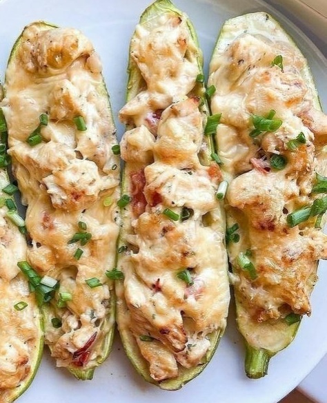 Кабачки вдоль режем пополам и вычищаем внутри, делаем лодочки) На противень наливаем водички, кладём лодочки и убираем в духовку на 15 минут. А пока готовим начинку. Курицу режем кусочками и обжариваем с маслом несколько минут, кладём лук кубиком, ещё пару минут жарим и кладём помидор кубиком. Приправляем по вкусу, тушим пару минут и выключаем, кладём сметану, перемешиваем. Достаём лодочки, укладываем начинку в них и сверху сыром посыпаем. Убираем кабачки в духовку ещё на 15 минут.