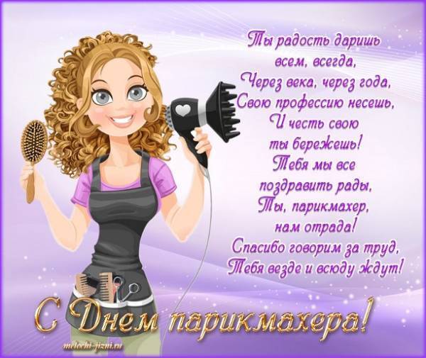 Поздравляю с Днем парикмахера! Желаю каждый день делать укладку счастья, состригать все проблемы и перекрашивать все полосы жизни в белый цвет! Желаю радовать своих клиентов своим великолепным мастерством и получать от жизни всё самое лучшее, доброе, радостное!