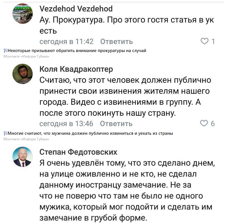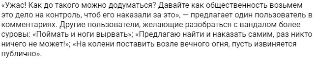 Практически все пользователи негодуют по поводу действий несознательного гражданина. Люди предлагают «депортировать гостя» за такой проступок, кое-кто хотел бы набить ему физиономию, самые законопослушные требуют писать заявление в отдел полиции.