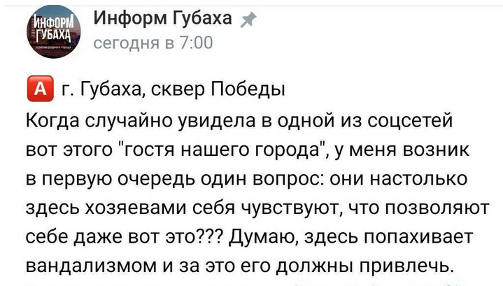Суть эксцесса в том, что один товарищ, который нам совсем не товарищ, сфотографировался, стоя на памятнике воинам, погибшим в Великую Отечественную войну. Пост и фотография отморозка выложена в группе «Информ Губаха» в социальной сети «ВКонтакте».