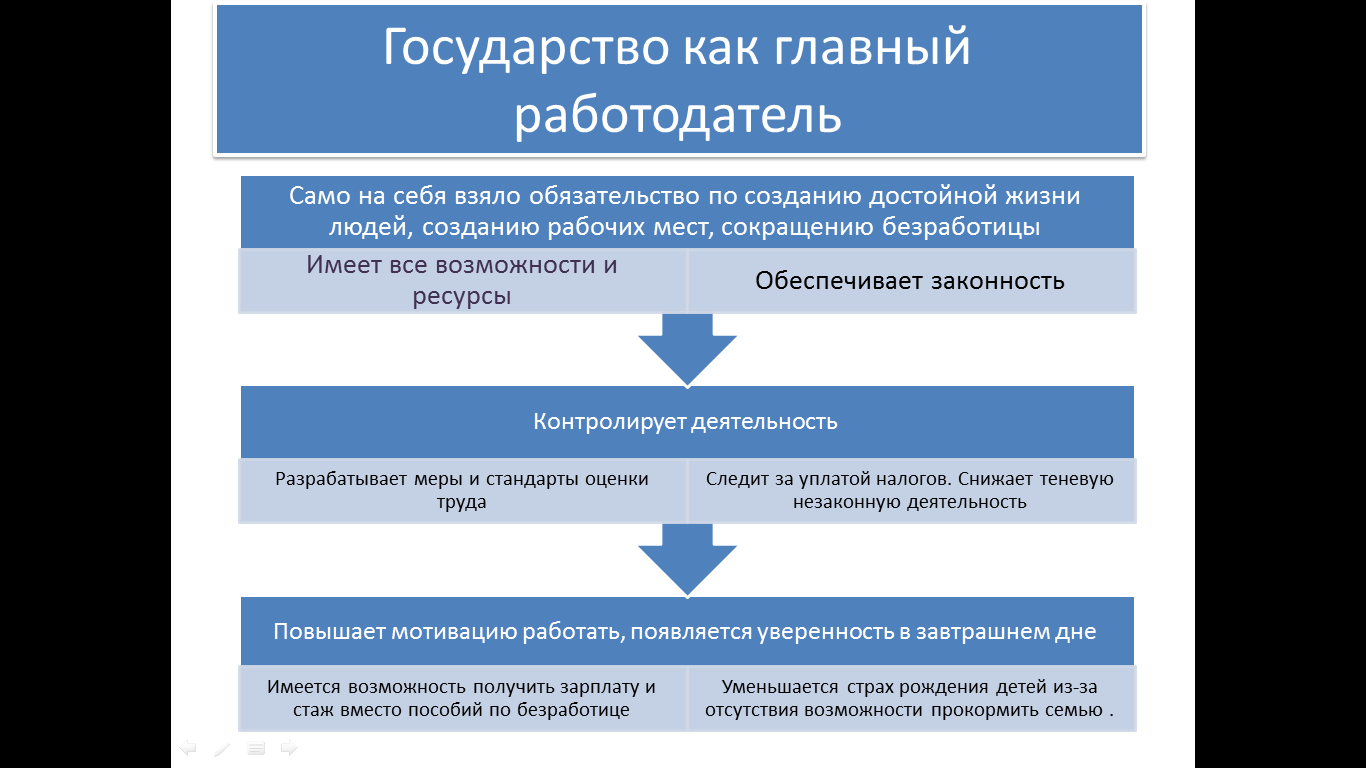 Итог: государство имеет ресурсы и возможности. Даёт рабочие места и защищает права граждан, сокращая и предупреждая безработицу. Повышает мотивацию и интерес к дальнейшему трудоустройству вместо сидения у него на шее, как и на шее налогоплательщиков за счёт пособий по безработице и т.д. Вместо этого оно выдаёт зарплату, учитывая налоги за трудовую деятельность. Обеспечивает прозрачность и контролирует работу на законных основаниях.