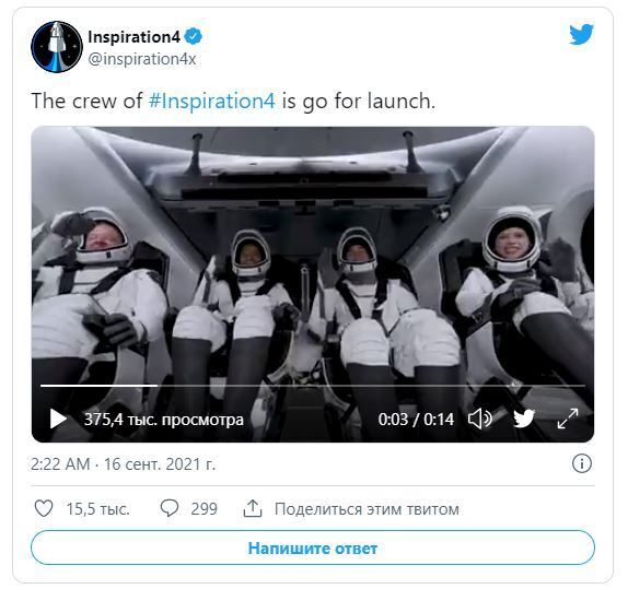 Космодром Канаверал… 20:02 по местному времени (03:02 16 сентября по московскому) стартовала ракета-носитель. На борту корабля оказались миллиардер Джаред Айзекман, исследовательница Сиан Проктор, помощник врача Хейли Арсенокс и ветеран Военно-воздушных сил (ВВС) США Кристофер Семброски.