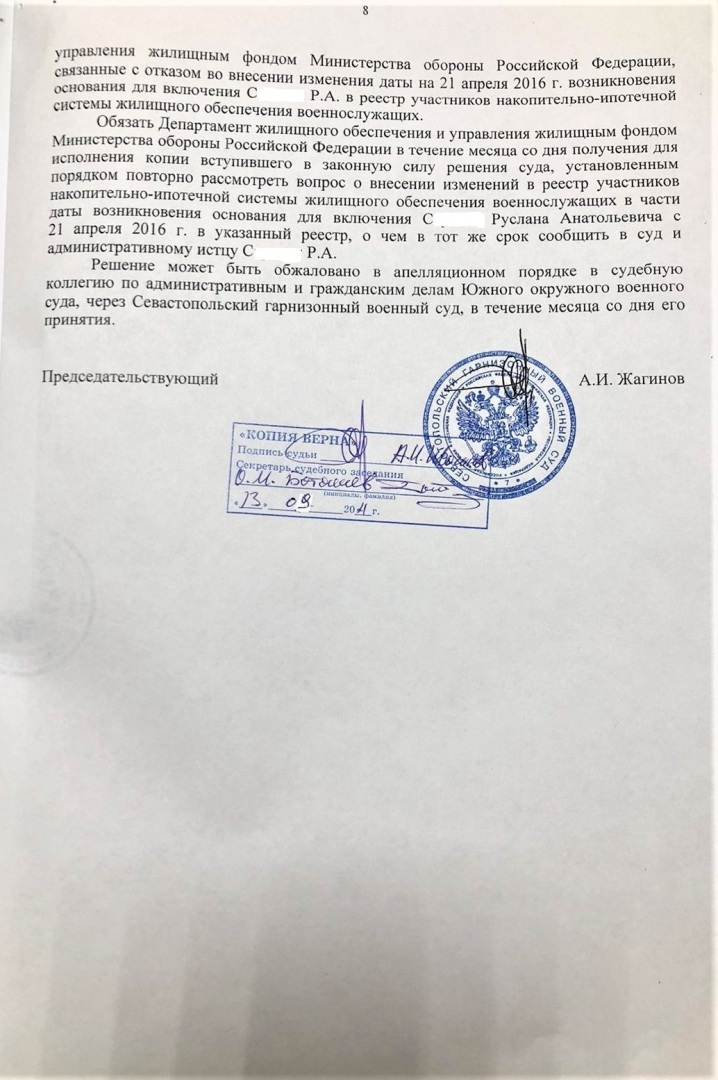 Решением Севастопольского гарнизонного военного суда от 13.09.2021 г. исковое заявление Клиента удовлетворено в полном объеме, признаны незаконными действия жилищного органа, возложена не него обязанность повторно рассмотреть вопрос о дате принятия военнослужащего в НИС с момента заключения контракта о прохождении военной службы в ВС РФ и подачи соответствующего рапорта о включении.