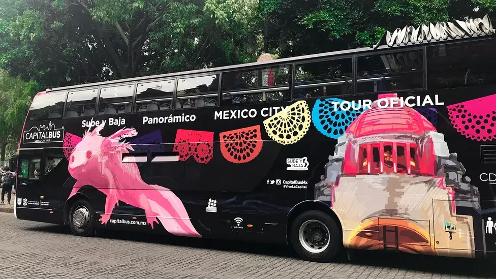 На последнем официальном туристическом автобусе Мехико изображен аксолотль-альбинос (Источник: Меган Фрай)