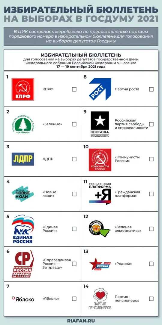 Основная кампания, к которой приковано внимание, это выборы депутатов Государственной думы Федерального собрания Российской Федерации VIII созыва. В них участвуют 14 партий, последовательность названий которых в бюллетене была установлена жребием. Как выглядит избирательный бюллетень на выборах в Госдуму по партийным спискам, представлено в инфографике ФАН. Депутаты-одномандатники, претендующие на места в парламенте, вносятся в другой бюллетень в алфавитном порядке. Если у кандидата есть судимость, он признан иностранным агентом или аффилирован с иноагентами, соответствующая информация указана в бюллетене и на стенде у избирательного участка.