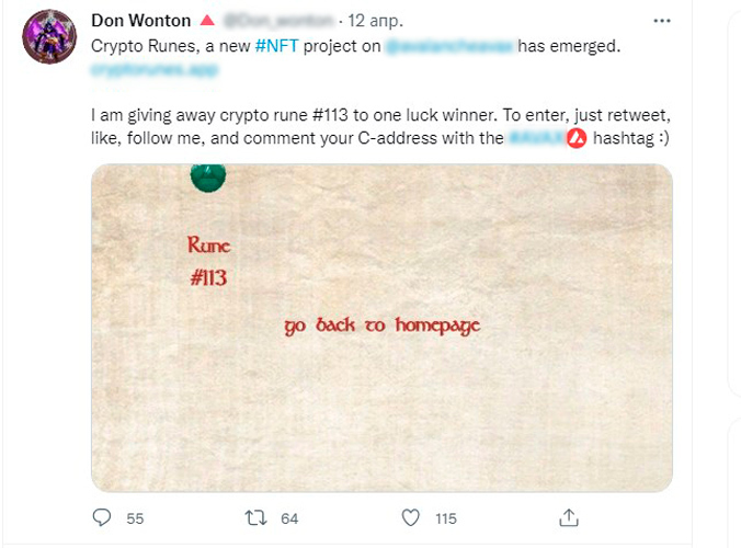 Например, компания Don Wonton, создавшая известный блокчейн-проект Avalanche, регулярно проводит лотереи NFT. Участвовать в них могут подписчики Twitter-аккаунта компании. Для этого нужно сделать ретвит конкурсного поста. В комментарии необходимо написать адрес электронного кошелька. В рамках каждой акции разыгрывается до 20 карточек. Получить монеты может каждый.
