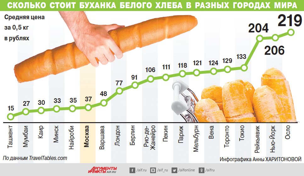 Внизу инфографика по стоимости хлеба в России и в некоторых зарубежных странах в 2019 году.