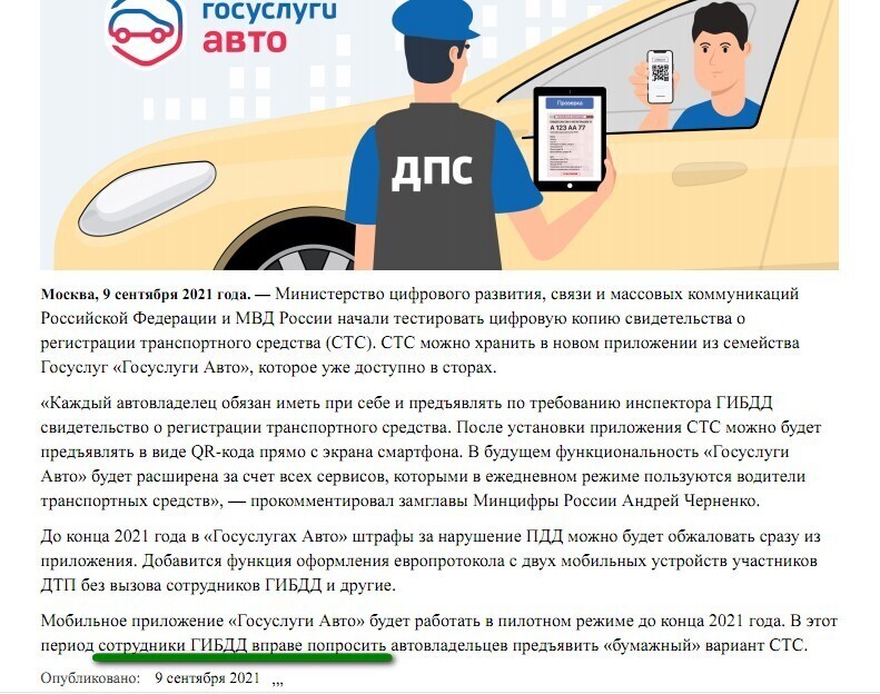 Минцифры России на период проведения эксперимента по применению электронного свидетельства о регистрации транспортного средства (до конца 2021 года) предоставило сотрудникам ГИБДД МВД России право "ПОПРОСИТЬ АВТОВЛАДЕЛЬЦЕВ ПРЕДЪЯВИТЬ "БУМАЖНЫЙ" ВАРИАНТ СТС"