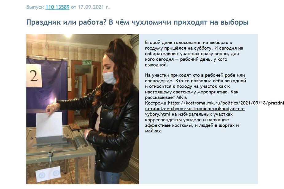 В Костромской области сразу нескольких районных газет решили осветить выборы с необычного ракурса. В изданиях «Вперед», «Буйская правда» и «Кологривский край» вышли публикации с одинаковым заголовком «Праздник или работа? В чем жители приходят на выборы». Особое внимание в них уделили тому, как одеваются избиратели. Журналисты пишут, что люди приходят голосовать и в нарядной одежде («для многих выборы — это праздник»), и в рабочих спецовках. Мантуровская «Авангард» тоже подняла тему гардероба избирателей. «Солдаты из воинской части в красивой форме приезжали, сразу несколько человек. Очень дружненько у них получилось проголосовать», — приводит слова председателя одного из участковых избирательных комиссий издание. К флешмобу районных газет подключилось и «МК в Костроме», написавшее про проголосовавшего священника и мужчину в футболке, шортах и сланцах при температуре на улице 7-8℃.