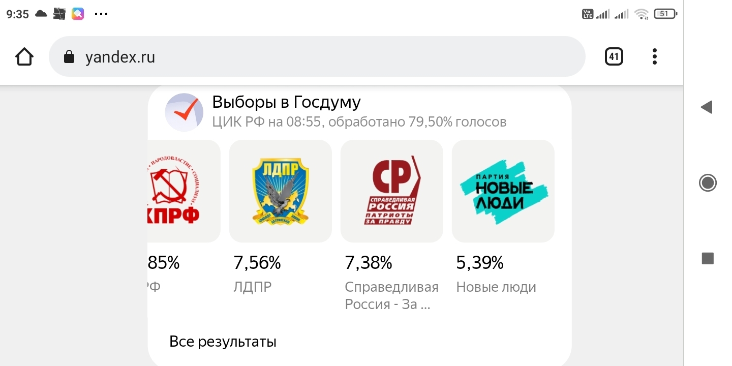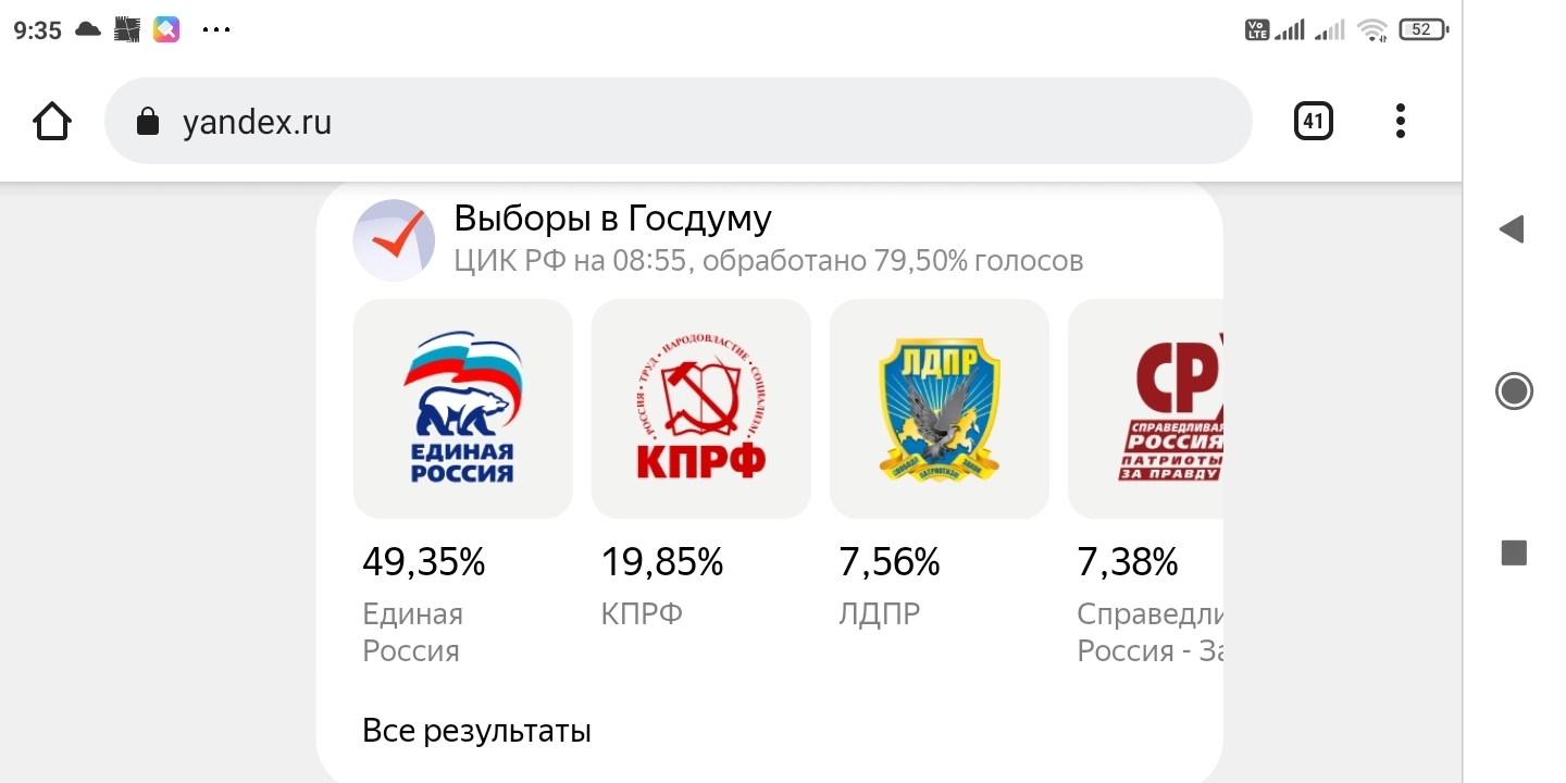 Вот прошли выборы и чуда не случилось. По данным ЦИК после обработки 79,5% голосов Ер на 8:55 по Москве набрала почти 50% голосов, КПРФ почти 20%, ЛДПР 7,56%, СР 7,38%, 5,39% .Подделка результатов в пользу партии власти для меня очевидна. Очевидна потому, что ну не может партия проголосовавших за пенсионный геноцид так поддержана народом.