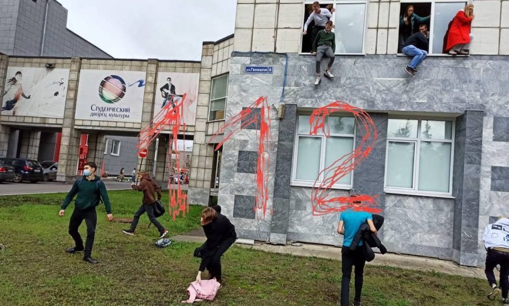 В Пермском государственном университете сегодня, 20 сентября, произошла стрельба. На кадрах, опубликованных с места событий, видно, как из одного из корпусов из окон выпрыгивают студенты, слышны звуки выстрелов.