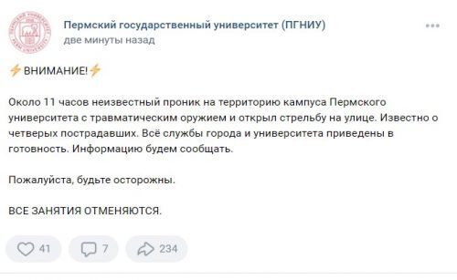 В пресс-службе университета изданию 59.ru подтвердили: неизвестный стрелял из травматического оружия, есть один пострадавший, он ранен в голову, но в сознании.