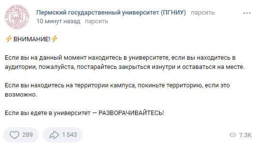 10:00. Официальная группа Пермского госуниверситета в ВК разместила призыв к студентам закрыться изнутри в аудиториях и оставаться на местах.