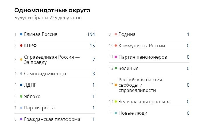 По данным ЦИК, у ЛДПР, "Родины", Гражданской платформы и Партии Роста также по одному кандидату-лидеру по итогам обработки 99,1% протоколов.