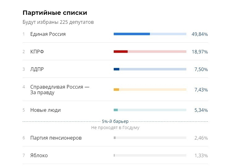 Таким образом, предварительно, в Госдуму проходят пять партий, преодолевая электоральный барьер в 5%.