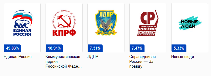 По итогам обработки 97% протоколов УИК, пятипроцентный барьер для прохождения в Думу преодолели пять партий – «Единая Россия» (49,47%), КПРФ (19,07%), ЛДПР (7,47%), «Справедливая Россия – за правду» (7,41%) и «Новые люди» (5,37%). Кандидаты от еще трех партий – «Родина», Партия Роста, «Гражданская платформа» – сумели выиграть в одномандатных округах. В ряде округов победили пятеро самовыдвиженцев.