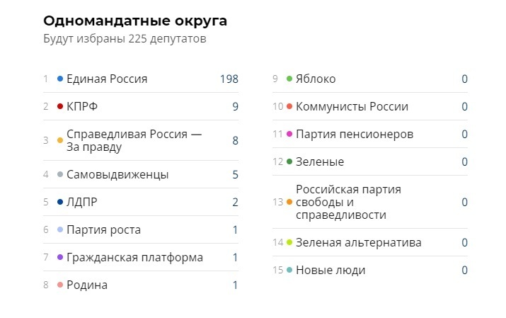 "Единая Россия" смогла взять 198 депутатских мандатов из 225 возможных. Партия КПРФ взяла только 9, хотя, после окончательного подсчета результат может немного измениться, плюс-минус одно кресло в Госдуме.