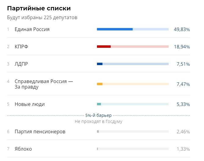 Однако, не стоит думать, что 49,83% у "Единой России" это итоговый результат, дело в том, что по партийным спискам в Госдуму попадает всего 50% депутатов, остальные идут по одномандатным округам, то есть, люди выбирали их отдельно, ставя галочку напротив конкретной фамилии в бюллетене.