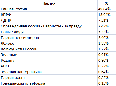 По итогам обработки 97% протоколов УИК, пятипроцентный барьер для прохождения в Думу преодолели пять партий – "Единая Россия" (49,47%), КПРФ (19,07%), ЛДПР (7,47%), "Справедливая Россия – за правду" (7,41%) и "Новые люди" (5,37%). Кандидаты от еще трех партий – "Родина", Партия Роста, "Гражданская платформа" – сумели выиграть в одномандатных округах. В ряде округов победили пятеро самовыдвиженцев.