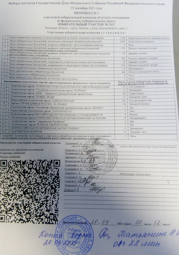 Спасибо. Сразу видно, что на вашем участке фальсификаций не было, поэтому КПРФ идёт впереди ЕД.