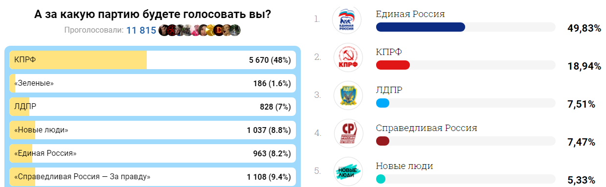 Вот и выборы прошли, подвели итоги, но не радуют они почему то нас, победила как всегда "Единая Россия" - обошла по всем статьям она рабочий класс. Слева - фото опроса перед выборами на этом сайте, кто и как собирался голосовать, а справа как "проголосовали". Выводы сделайте сами! Так почему же мы проиграли?