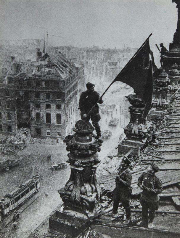 Это культовое фото Второй мировой войны является самой перепечатанной фотографией. На снимке изображен солдат, поднимающий советский флаг на разрушенном здании нацистского парламента в Берлине, хотя историки теперь считают, что к моменту прибытия на место происшествия официального военного фотографа Халдея парламент уже был покрыт знаменами по всему периметру. Другими словами, он опоздал. Поэтому вместо этого Халдей попросил нескольких солдат, которые оказались там, помочь устроить фотосессию. Он нашел выигрышный угол отснял два мотка пленки.