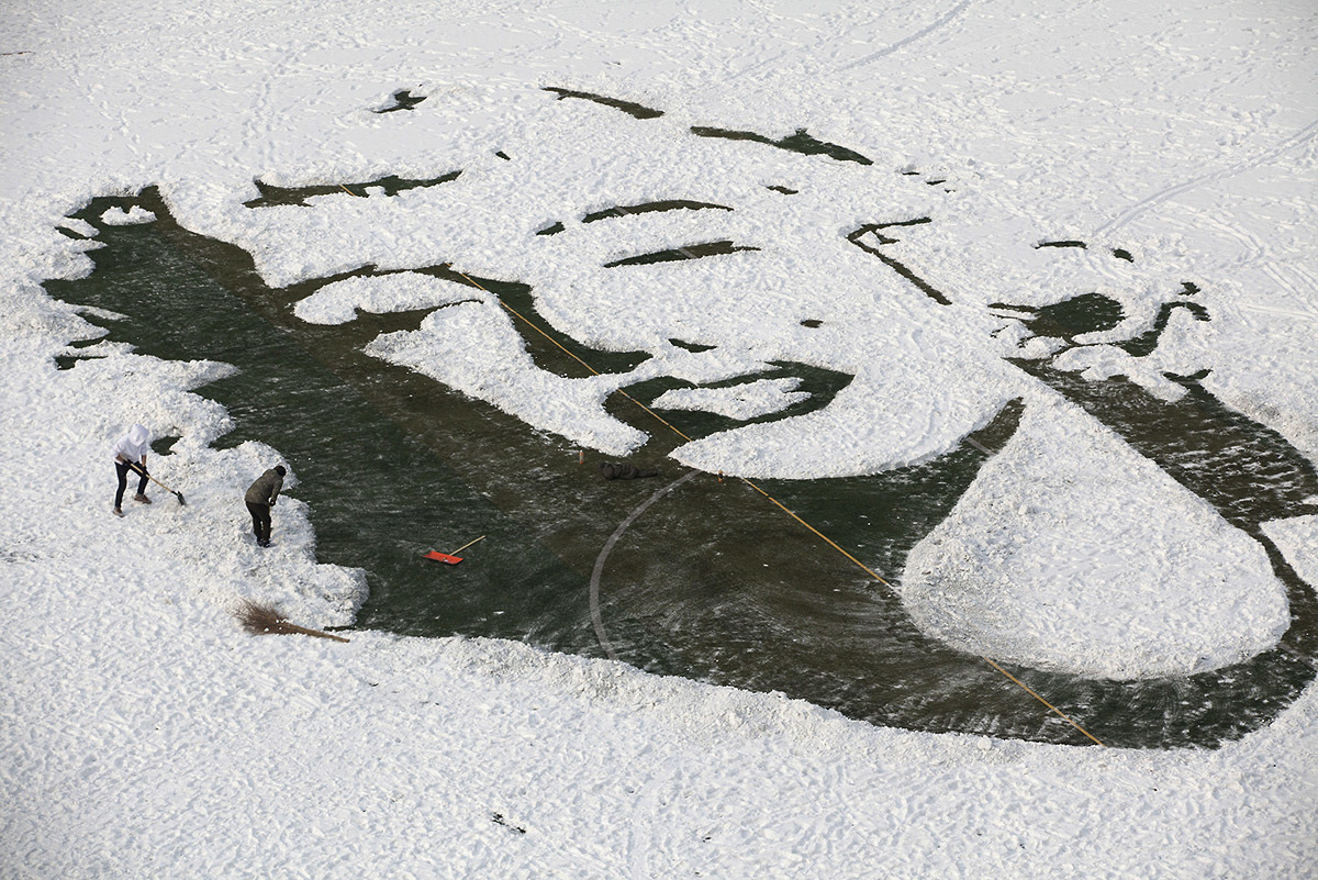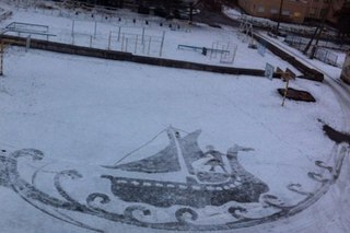 Талантливый дворник , создающий картины на снегу