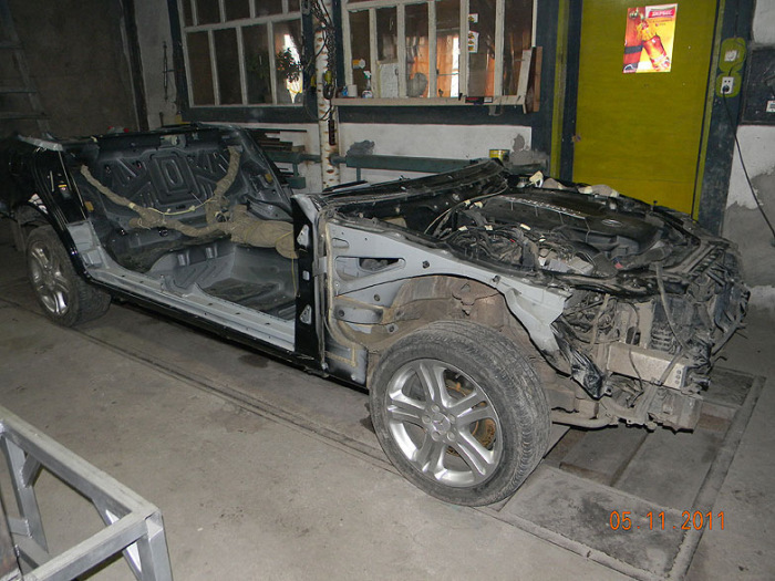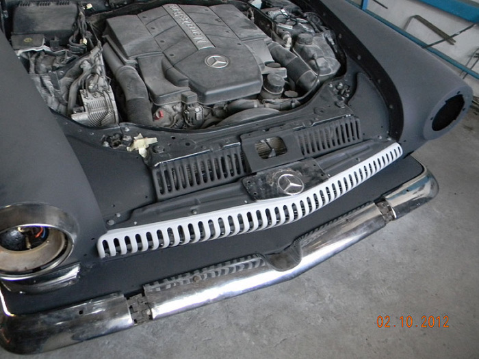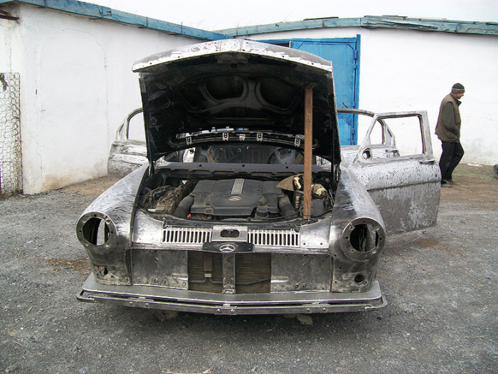 Для начала мастера «раздели» Mercedes-Benz. Машина была избавлена от всех кузовных панелей. От машины осталось фактически одно шасси и двигатель. После этого тюнеры стали «наращивать» детали от «Волги». Часть запчастей пришлось дорабатывать руками. Дело в том, что шасси немецкого автомобиля длинне, чем советского. Поэтому пришлось добавлять 200-300 мм. Закрывали щель частями от двух дополнительных ГАЗ-21.
