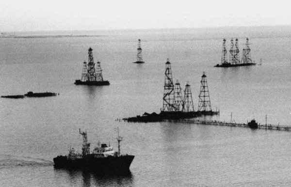 После войны советские инженеры приехали на прибрежный островок, который моряки называли "Черная скала". Они построили сарай на крошечном острове и провели пробное бурение. В ночь на 7 ноября 1949 года, они обнаружили высококачественную нефть на глубине 1100 метров ниже уровня морского дна и вскоре после этого, на этом месте была возведена первая морская платформа по добыче нефти в мире. Платформа была примитивна, по сравнению с современными мастодонтами, ведь она состояла в основном из дерева.