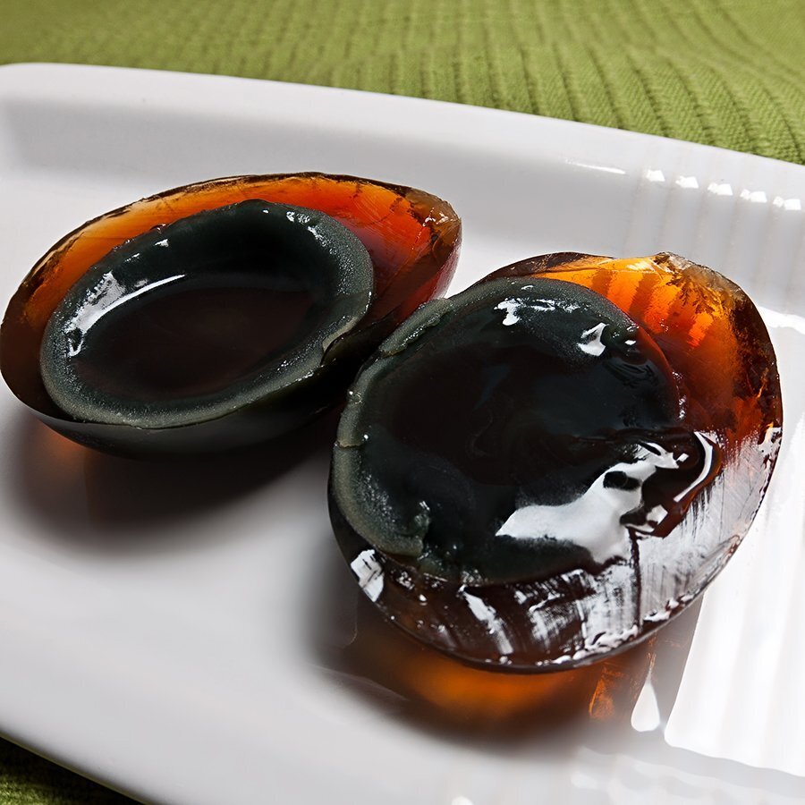 Так например, жители Китая с давних времен употребляют в пищу популярную закуску, которую они называют «столетнее яйцо» или сунхуадань, что в буквальном переводе означает «яйца цветов сосны». У этого блюда тёмный жёлток и чёрный белок.