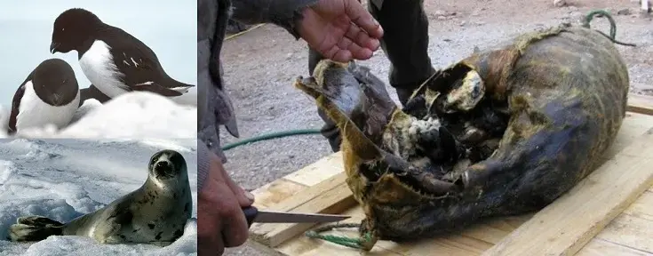 Очень опасным для нашего желудка будет эскимрское блюдо под названием "кивиак" Что же это такое? Это тюлень, фаршированный птицами. В шкуру млекопитающего, закладывают разную морскую птицу. Тушки не потрошат и не ощипывают, перемежаются слоями тюленьего жира. Дальше по аналогии с выше приведённым чукотским блюдом «готовится» в естественных условиях на протяжении нескольких лет.