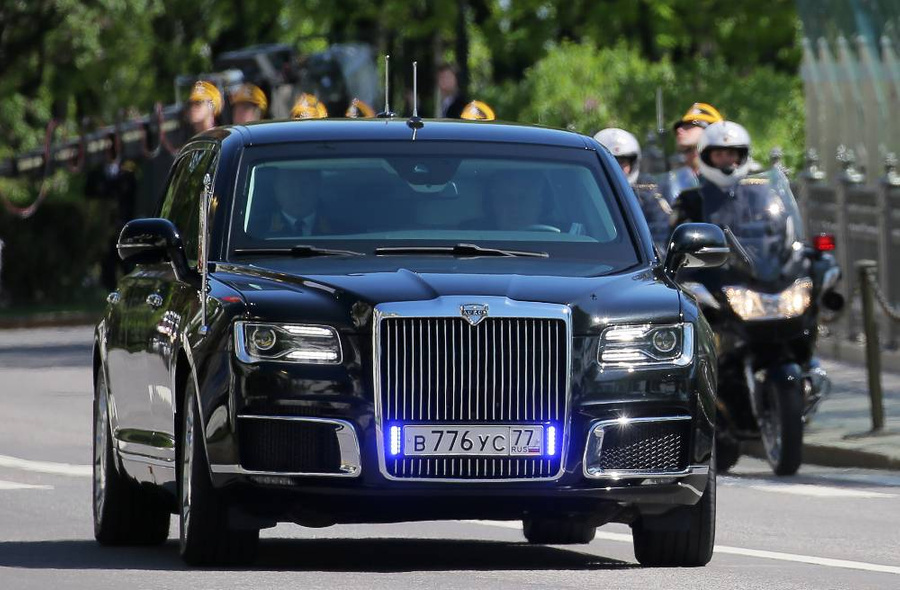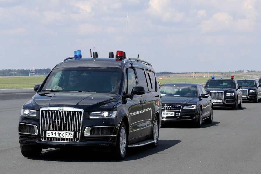 Aurus попадают на территорию принимающей стороны как дипломатическая почта — не в таком же виде и не в объёмном мешке с печатями и пломбами, но в том же статусе. Досматривать их нельзя, а встречают их сотрудники генерального консульства. Так было и в этот раз — три Ил-76 вылетели из Москвы за пару дней до начала всех мероприятий. До границ России эти самолёты всегда сопровождают один-два истребителя, а после того как борты входят в воздушное пространство другой страны, им выдаётся "особый эшелон", которым машины следуют к месту посадки. Всего в кортеже президента — около пяти-семи разных Aurus (от флагманского лимузина до седанов Senat для членов делегации). Общая численность кортежа президента России может достигать 15 автомобилей, не считая машины с охраной от принимающей стороны.