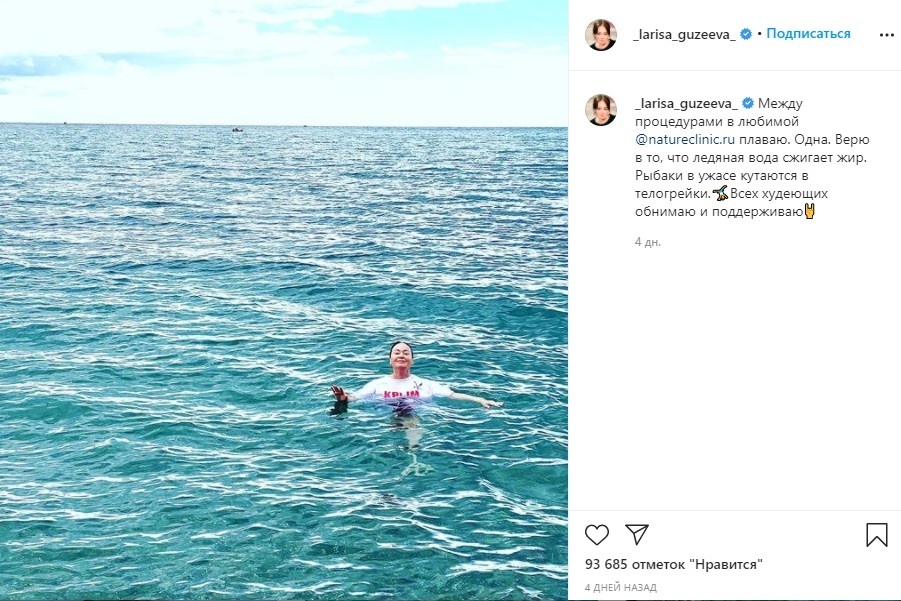 Лариса Гузеева является активным пользователем Instagram****. В последние дни она делилась со своими подписчиками контентом из частной медицинской клиники в Крыму, где она поправляла свое здоровье: плавала, ходила на различные процедуры.