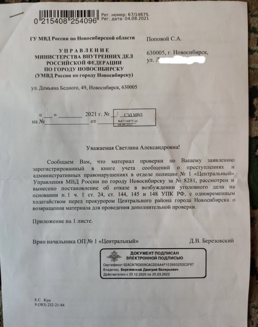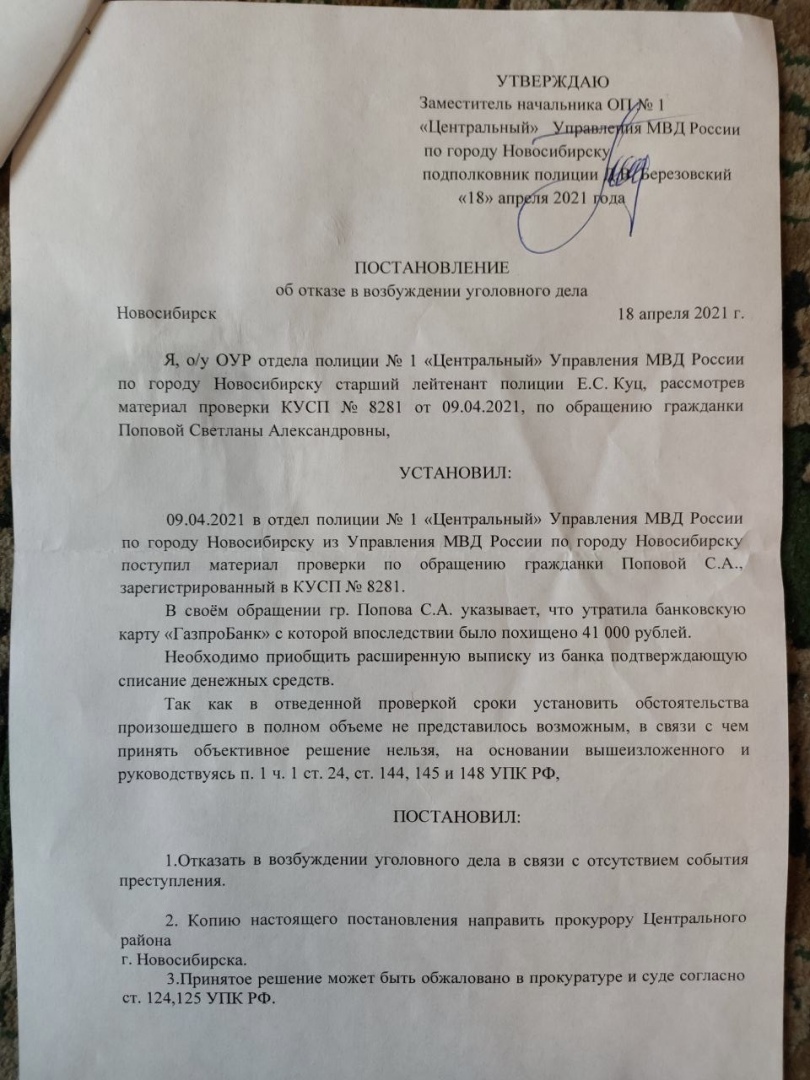 Управление МВД по городу Новосибирску отказывает в возбуждении уголовного дела по заявлению о похищении денег с банковских карт. Причиной в постановлении указывает отсутствие события преступления. Так 09.04.2021 гражданка Попова.С.А обратилась в отдел полиции №1 «Центральный» Управления МВД РФ по г. Новосибирску. В своём обращении гр. Попова указала, что утратила банковскую карту с которой впоследствии было похищено 41 000 рублей. Полиция вынесло постановление об отказе в возбуждении уголовного дела в связи с отсутствием события преступления.