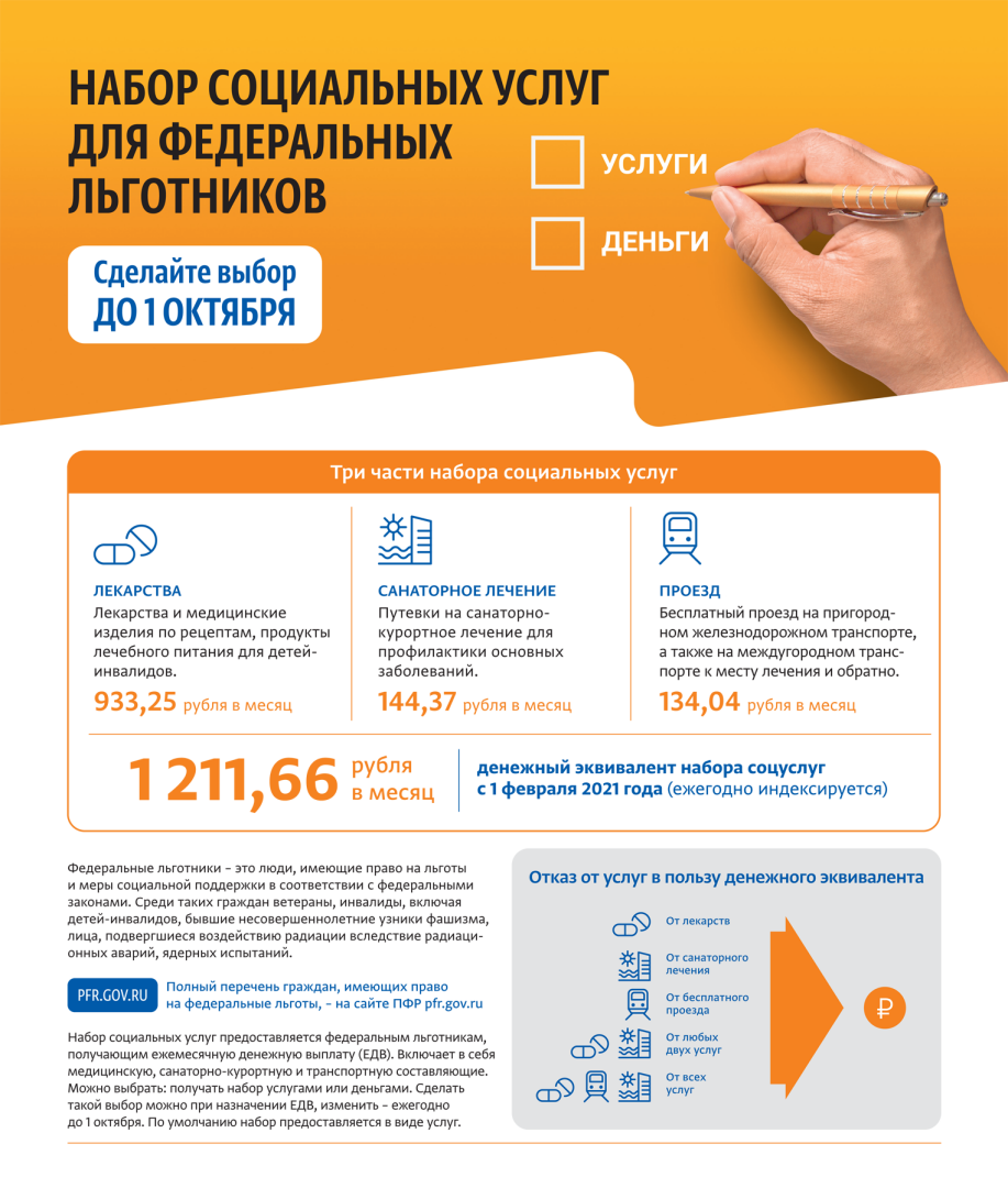 Люди, имеющие право на федеральные льготы и меры социальной поддержки (подробнее), могут до конца сентября определить, в какой форме получать набор социальных услуг: натуральной или денежной. При выборе натуральной формы набор предоставляется лекарствами и медицинскими изделиями, также можно оформить путевку в санаторий и бесплатный проезд на пригородных электричках.
