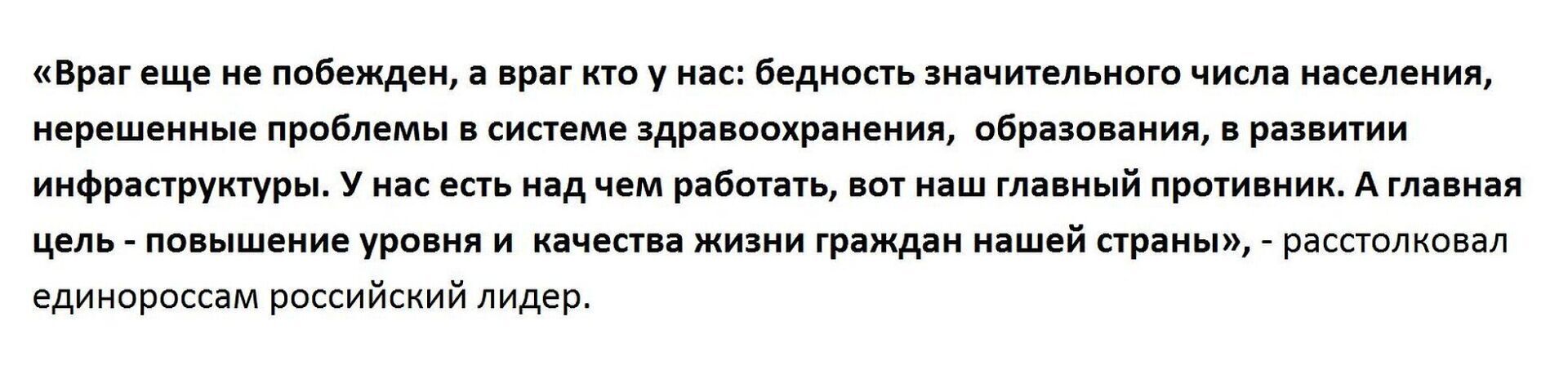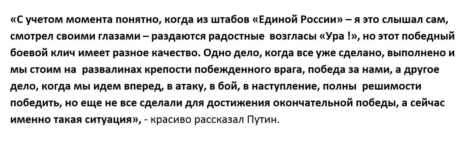 После триумфальной, честнейшей и праведной победы «Единой России» на выборах в Государственную Думу, Владимир Путин провёл пояснительную беседу с пятёркой главарей любимой партии. Чтобы погасить, так сказать, «головокружение от успехов» и объяснить текущую ситуацию президент использовал героически-образную риторику: