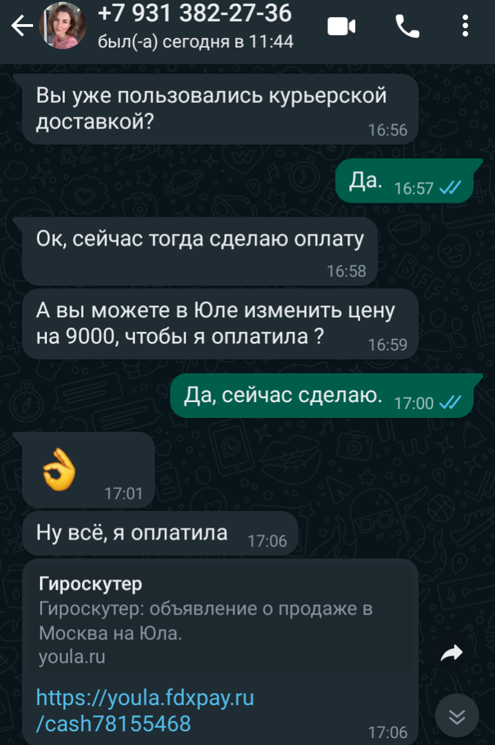Только после оплаты сообщение приходит от сайта бесплатных объявлений, но никак не от покупателя. Естественно, я сразу понял, что дело не чисто, но диалог продолжил.