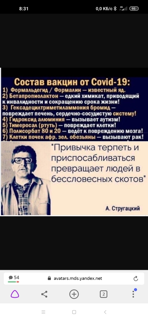 Сергей не знаю как в пятерочке и других местах о которых Вы пишете, соседи сделали вторую прививку от Ковида, сдали ПЦР тест оказалось все трое больны, медицина сделала огромный шаг...))))? От чего прививают от того и болеют...)))? Двое - это муж и дочь, переболели в лёгкой форме, жену соседа увидел только через несколько дней сразу не узнал, согнувшись в три погибели в опущенном капюшоне в разгар лета когда утром жарко уже, ходила по своему участку, я поздоровался, она меня сразу не узнала взгляд пустой, как дела спросил я, чтобы избежать неловкого молчания..., она сказала очень плохо и сердце болит..., ходим в один и тот же магазин, здороваемся за руку, прививаться вакциной не гарантирующей иммунитета не собираюсь, отговаривать то же...)))? Выбор каждого...)))? А то что Вы работаете в НИИ так это не делает организацию солидной, как и любой институт, не уточнив, что за НИИ, Вы оставляете право на выбор...)))? Я выбираю « Институт Чудес...))) Стругацкие фильм снят на основе сюжета « Чародеи »...)))?