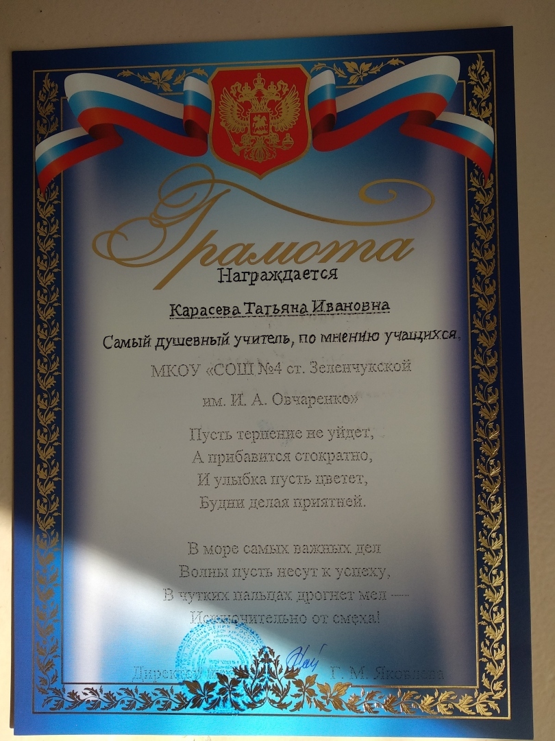 . Школа бедная, администрация не раскошеливается даже на грамоты. Учителя сами их приносят для себя и для учеников, которые заняли какое-то место в конкурсе или олимпиаде. Начальство часто плачется, что им самим приходится покупать дорогую краску и бумагу для принтеров. Поэтому качество печати "отменное", особенно "стараются", если тебя "любят (начальство) всей душой" за бойцовский характер и видят неподдельную детскую любовь и привязанность.